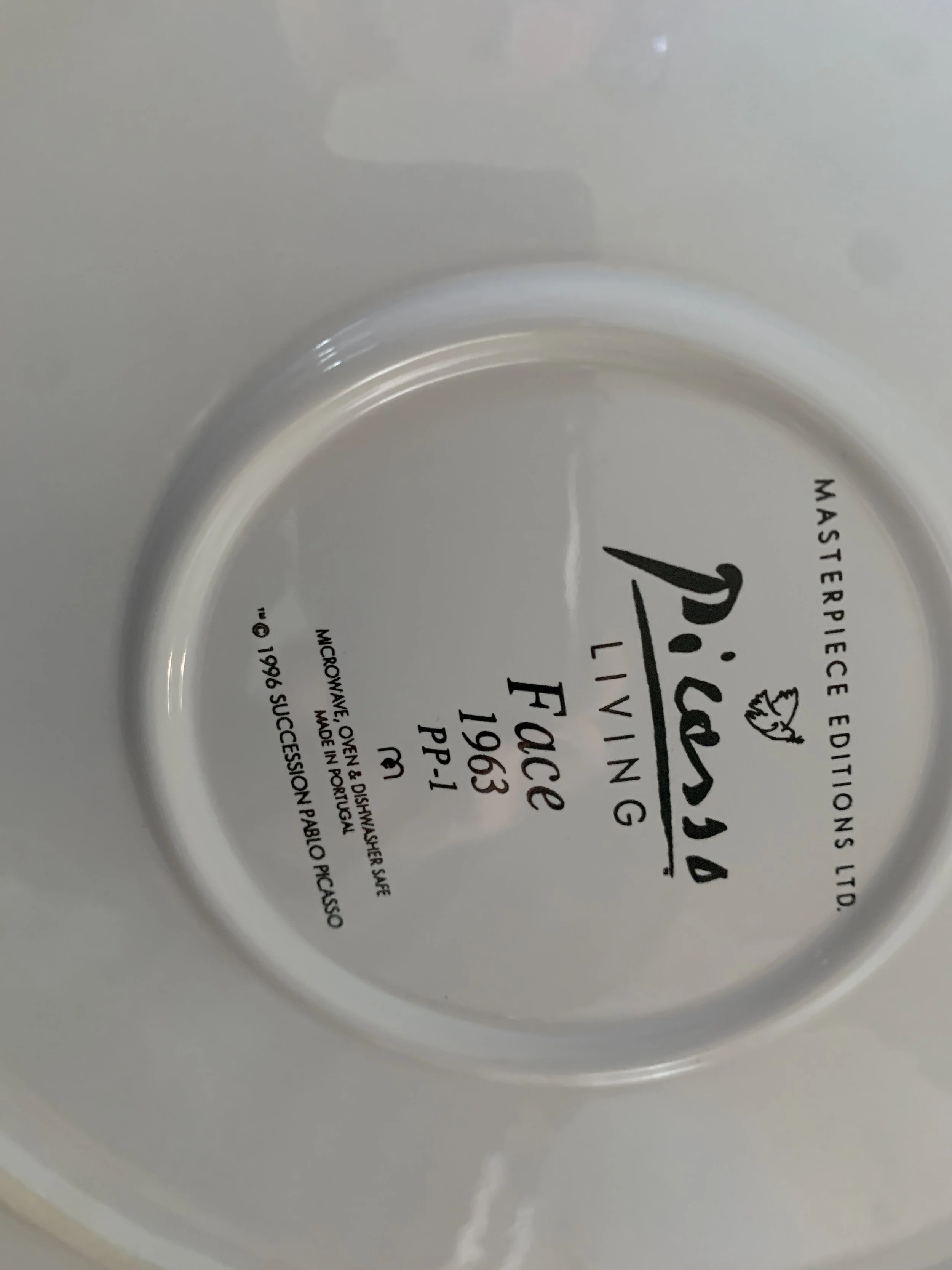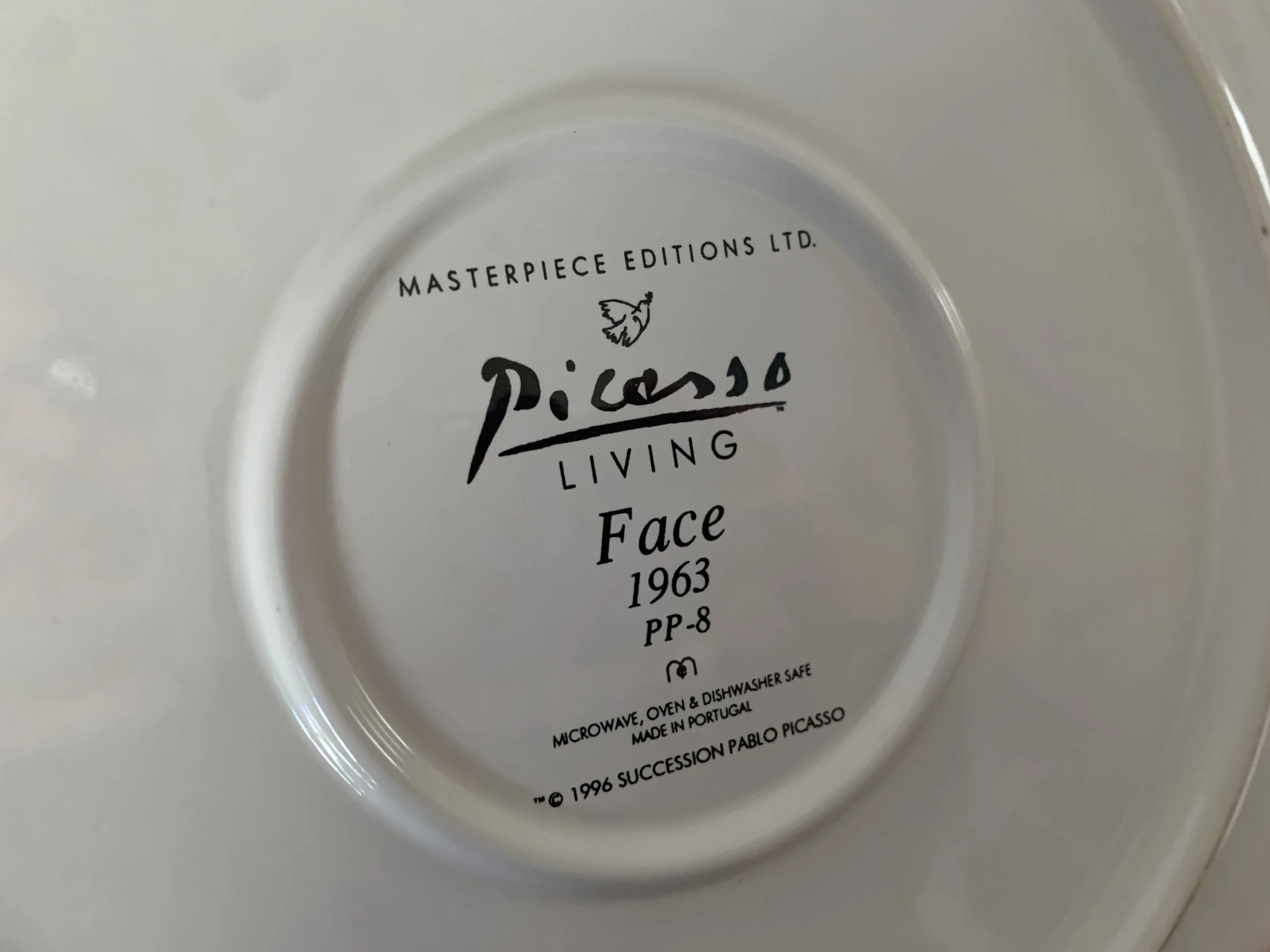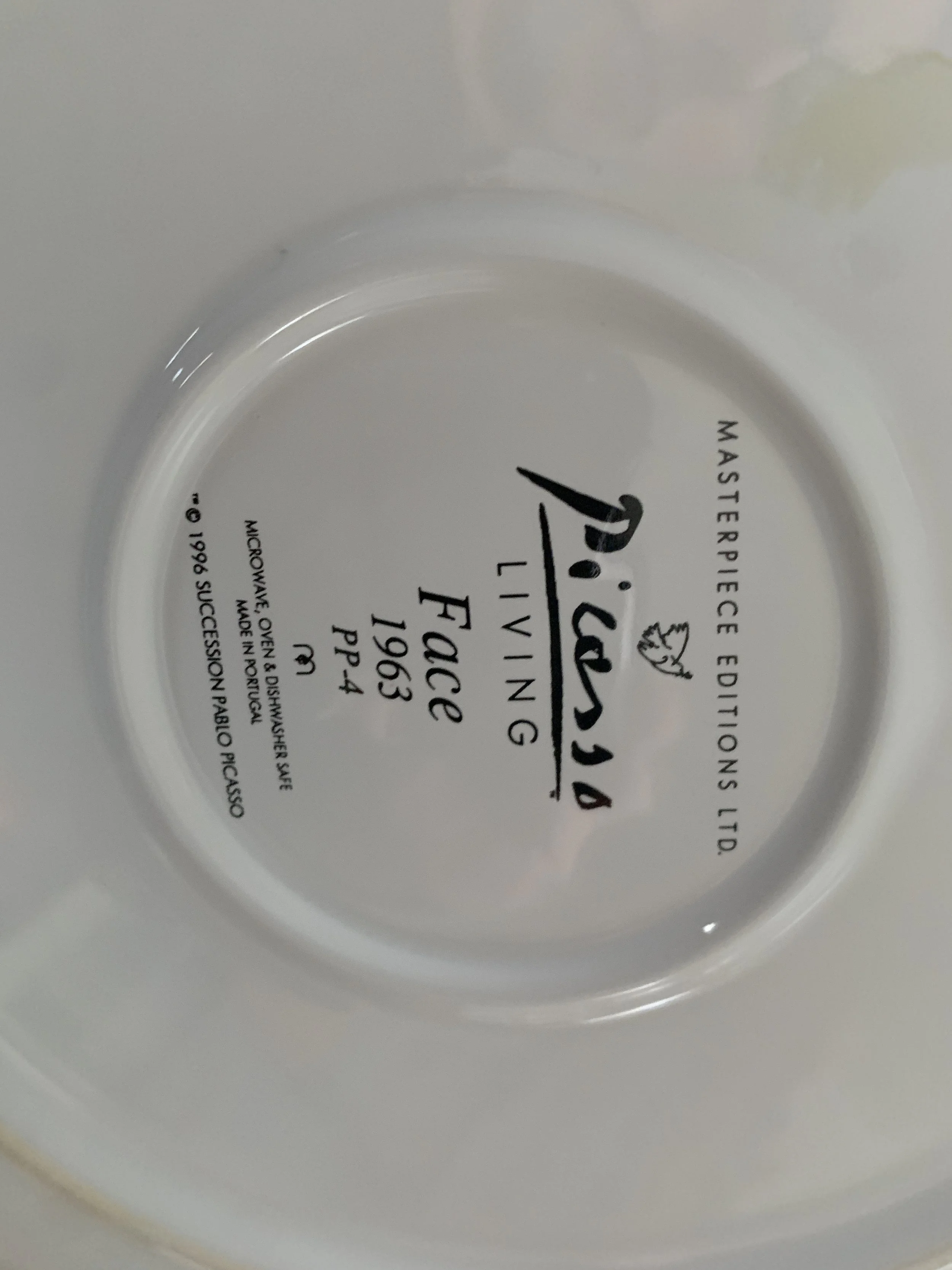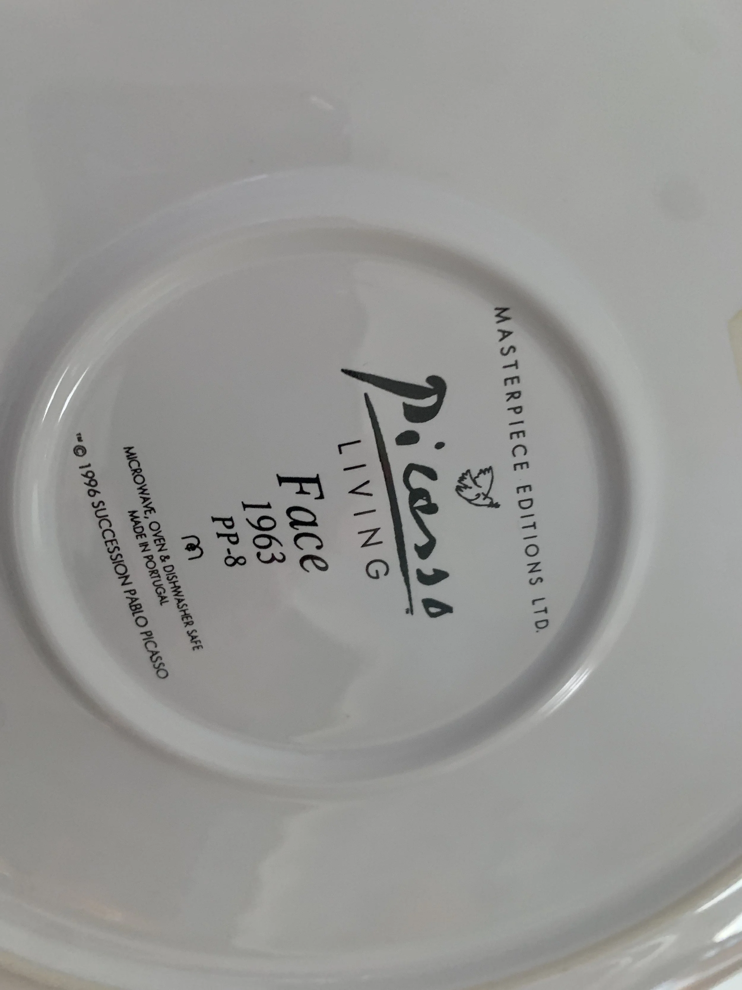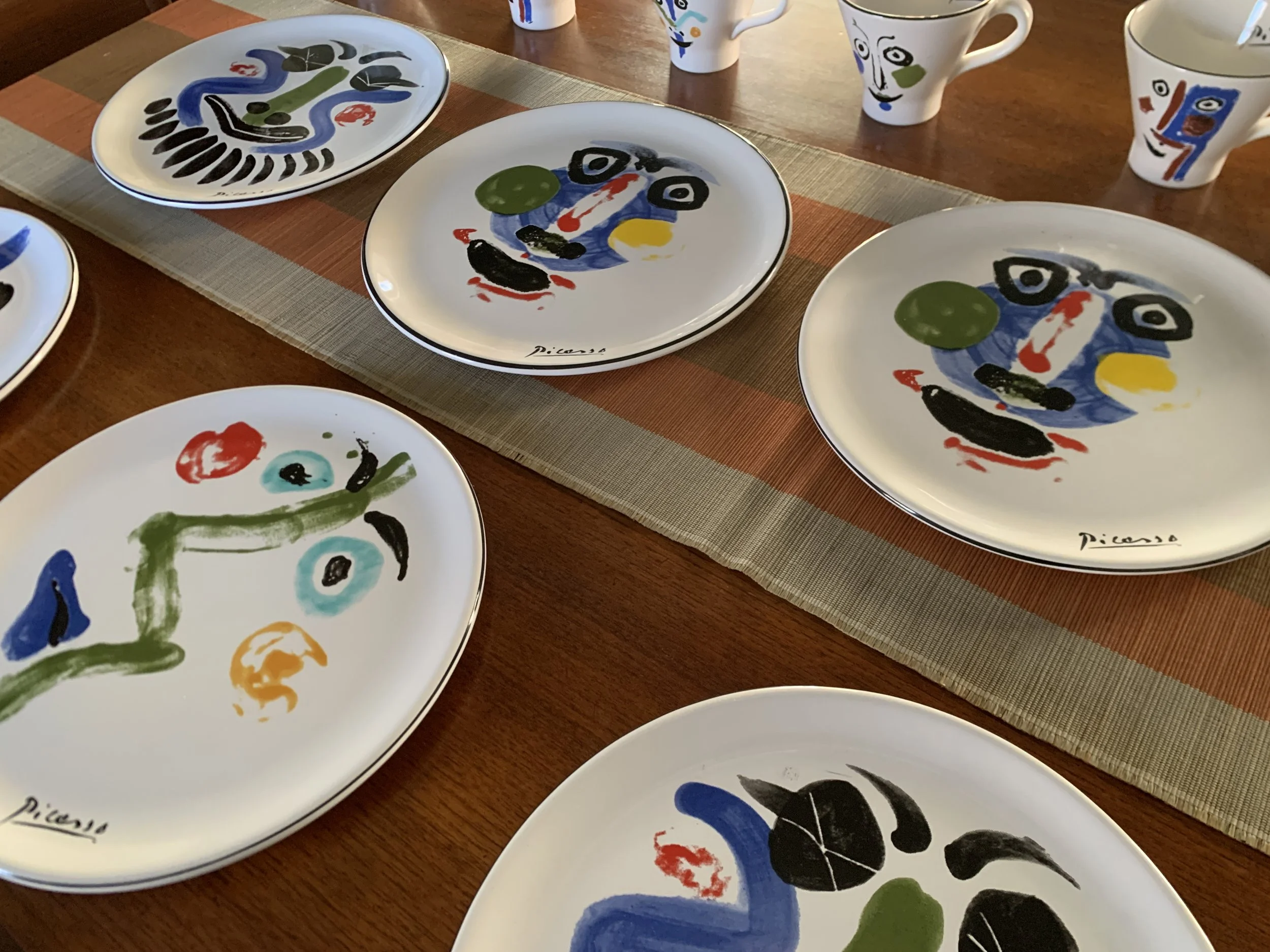 Large set of Picasso Living collection dinnerware. The "Face" Collection (1963) features minimalist, abstract faces on a white background with a thin black rim. This vintage dinnerware, produced in the mid-1990s by Masterpiece Editions Ltd., were typically manufactured in Portugal or Thailand and feature high-quality reproductions of Pablo Picasso's original artworks.