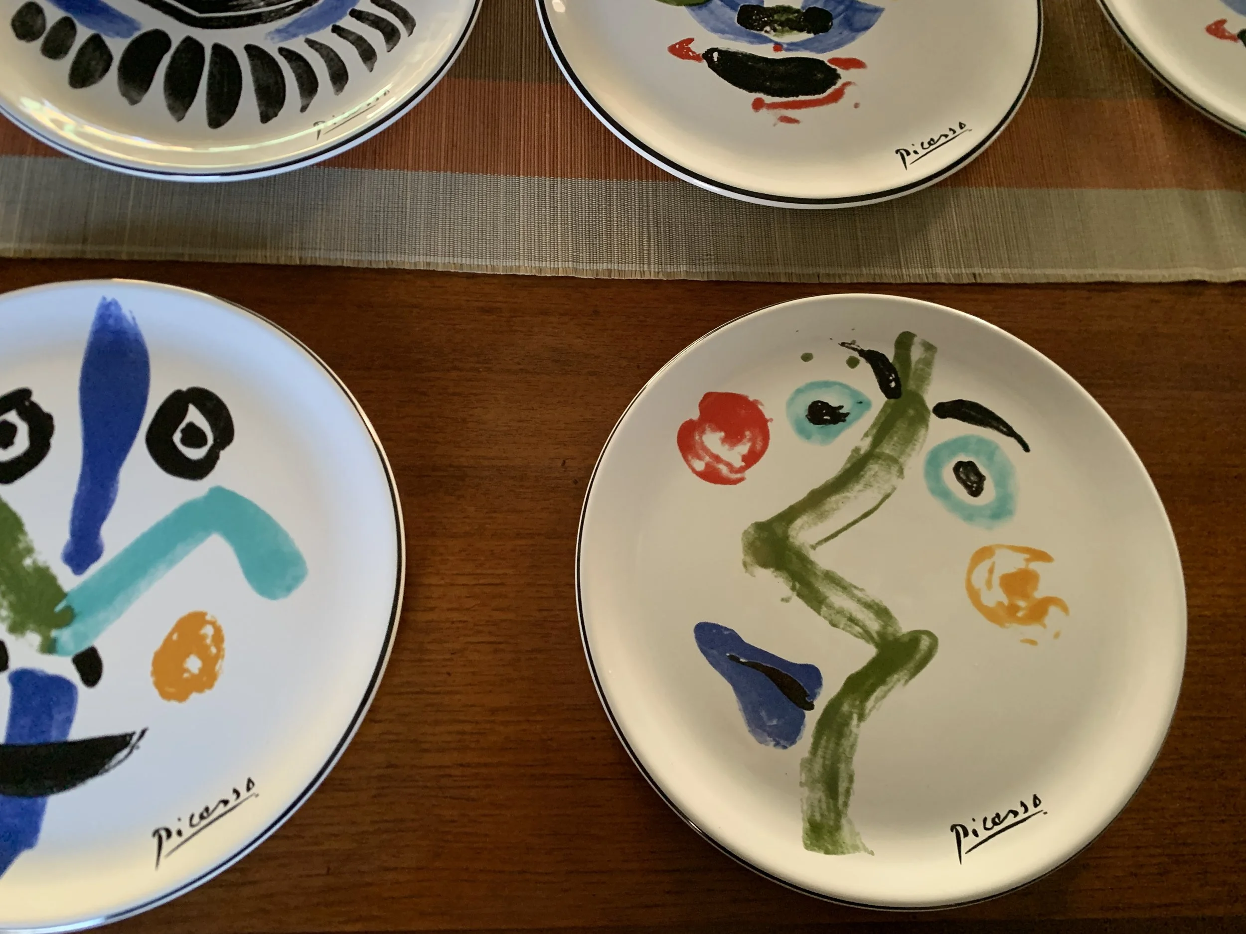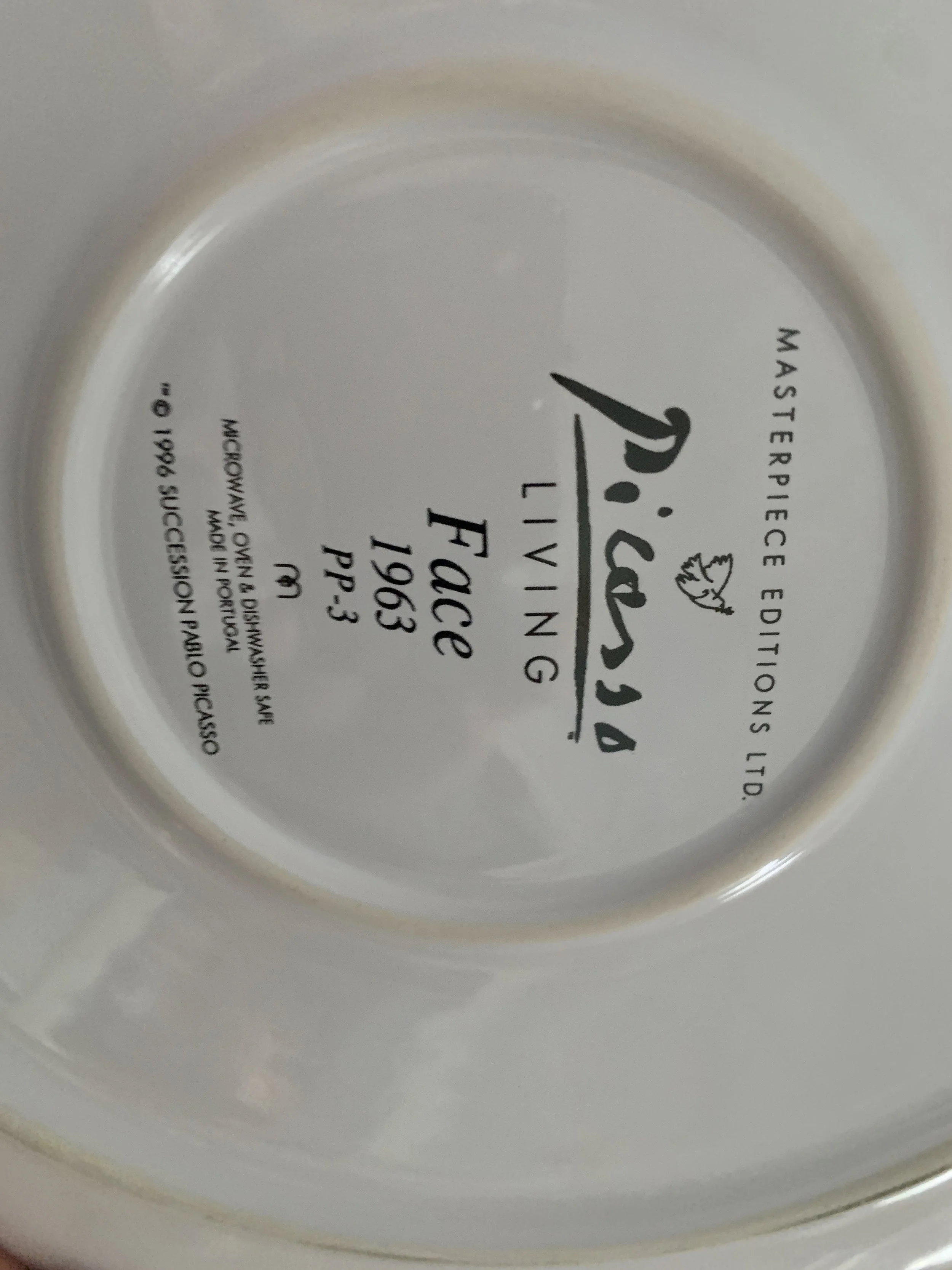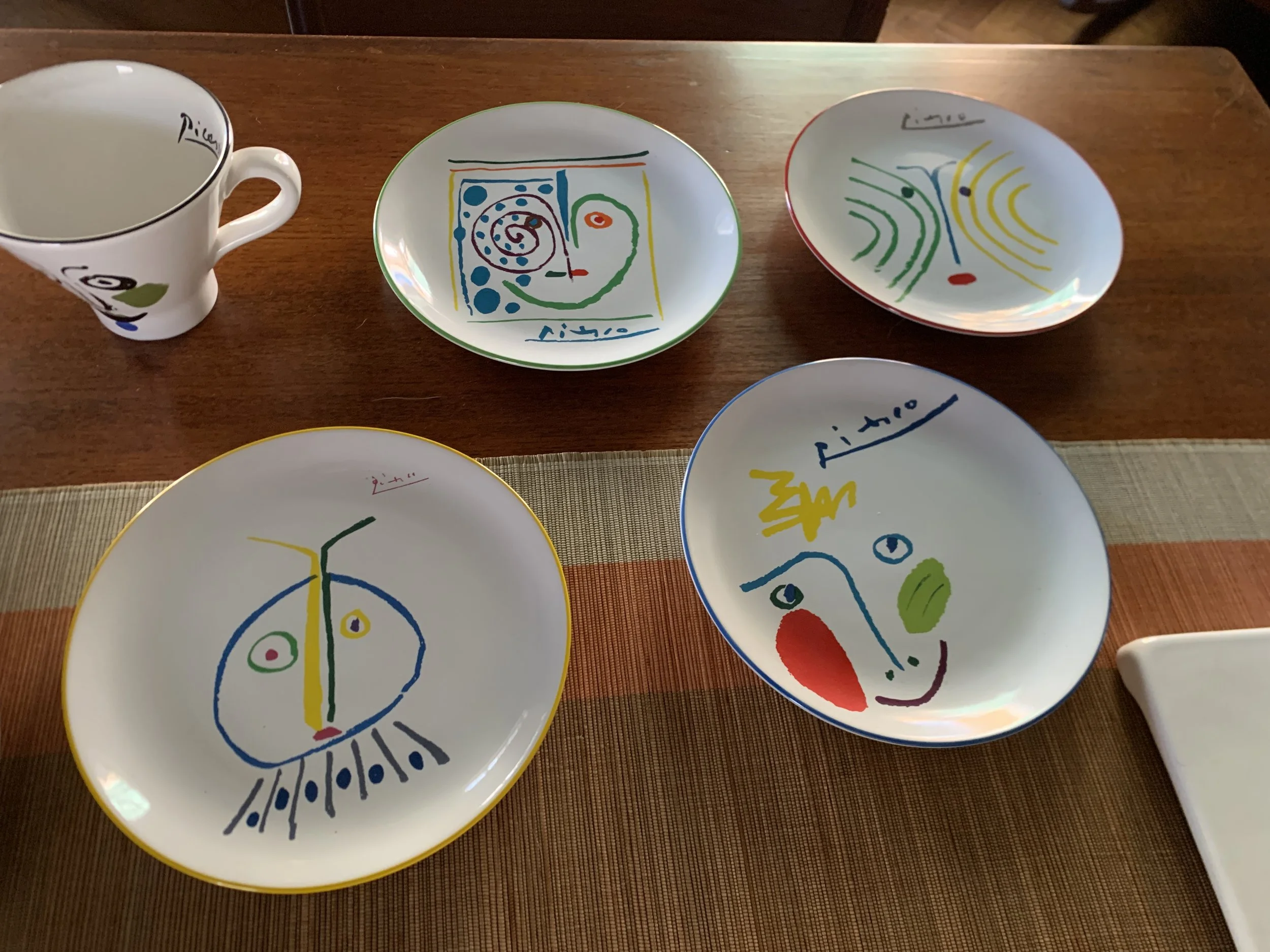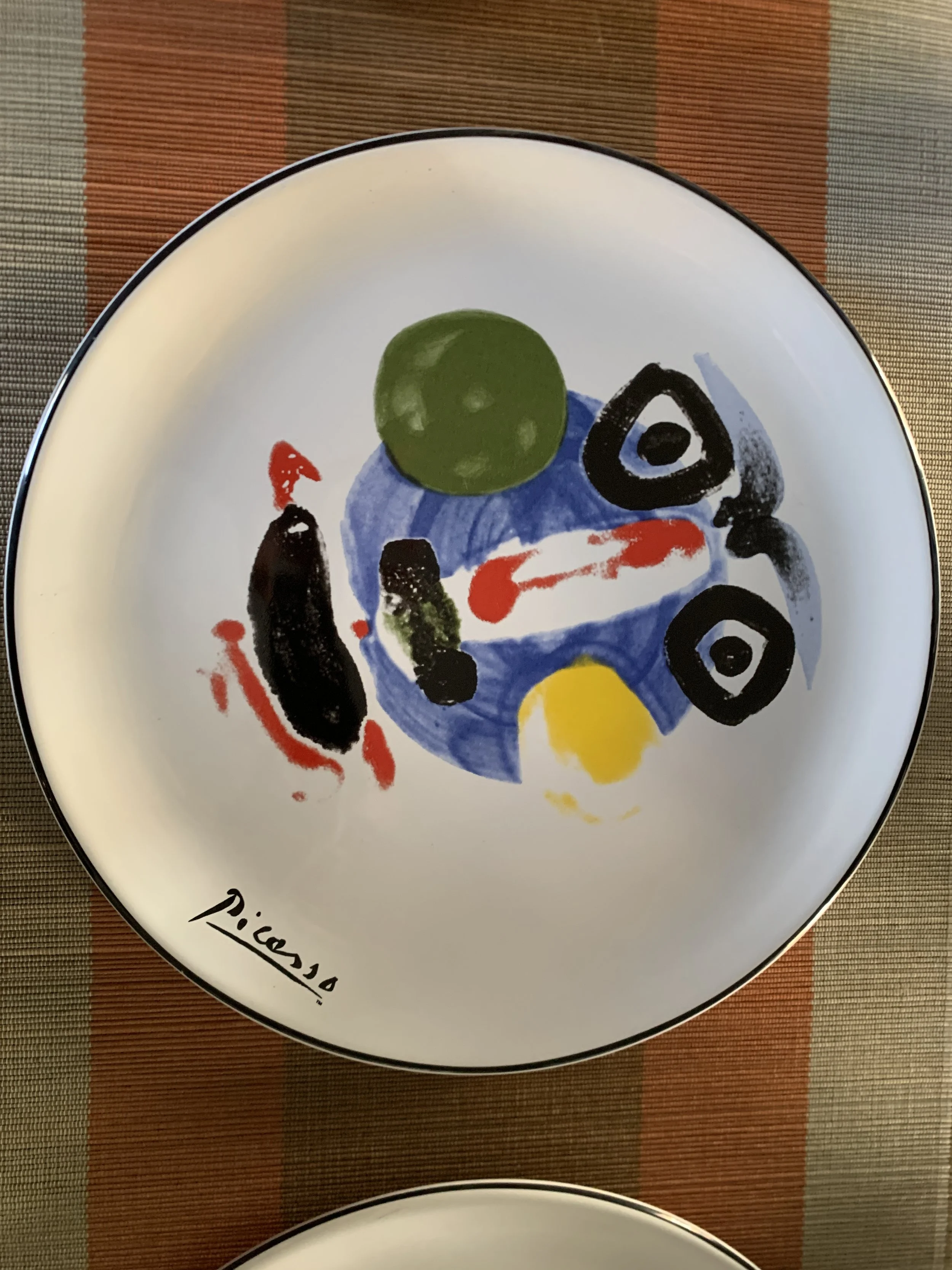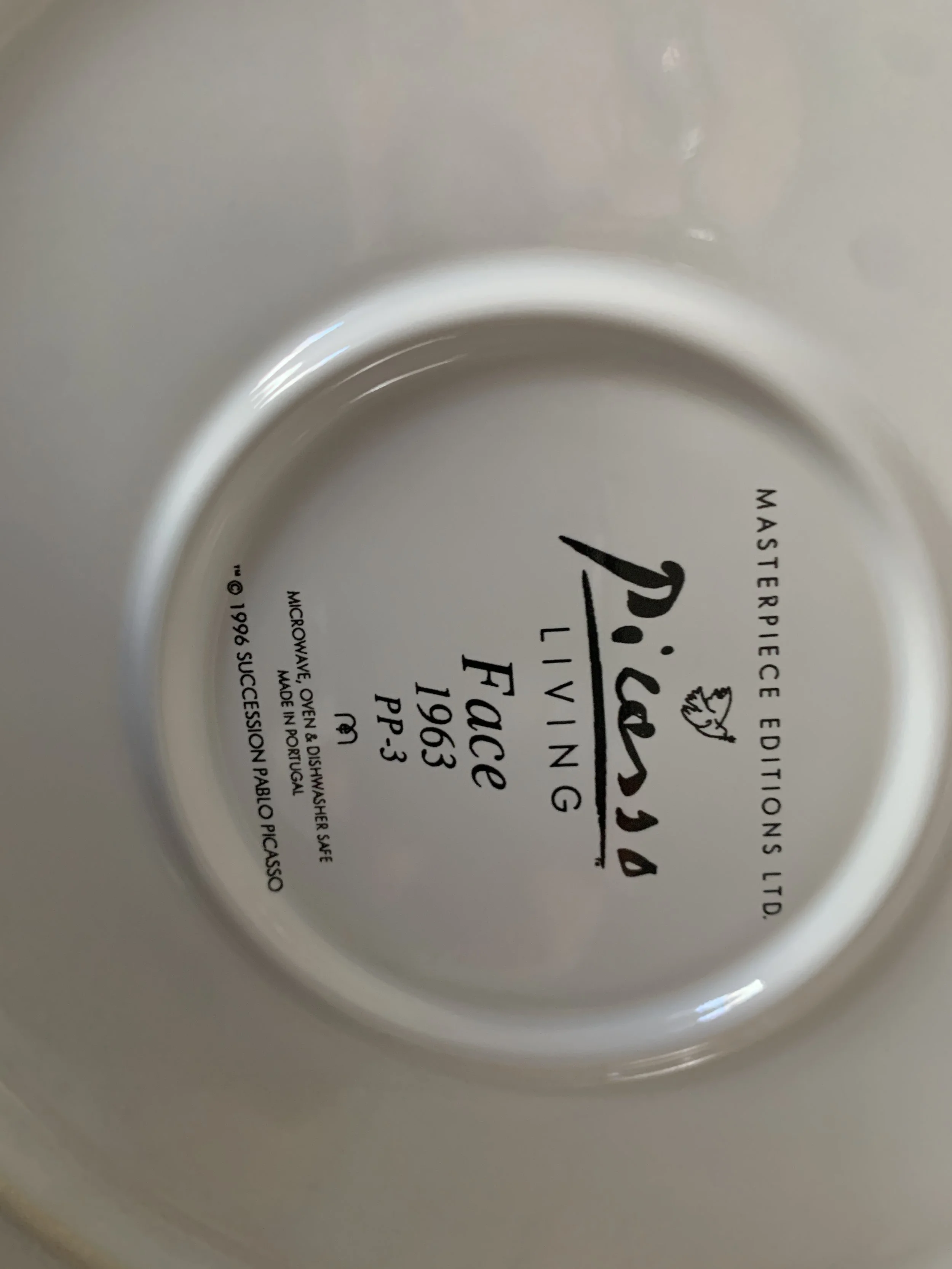 Large set of Picasso Living collection dinnerware. The "Face" Collection (1963) features minimalist, abstract faces on a white background with a thin black rim. This vintage dinnerware, produced in the mid-1990s by Masterpiece Editions Ltd., were typically manufactured in Portugal or Thailand and feature high-quality reproductions of Pablo Picasso's original artworks.
