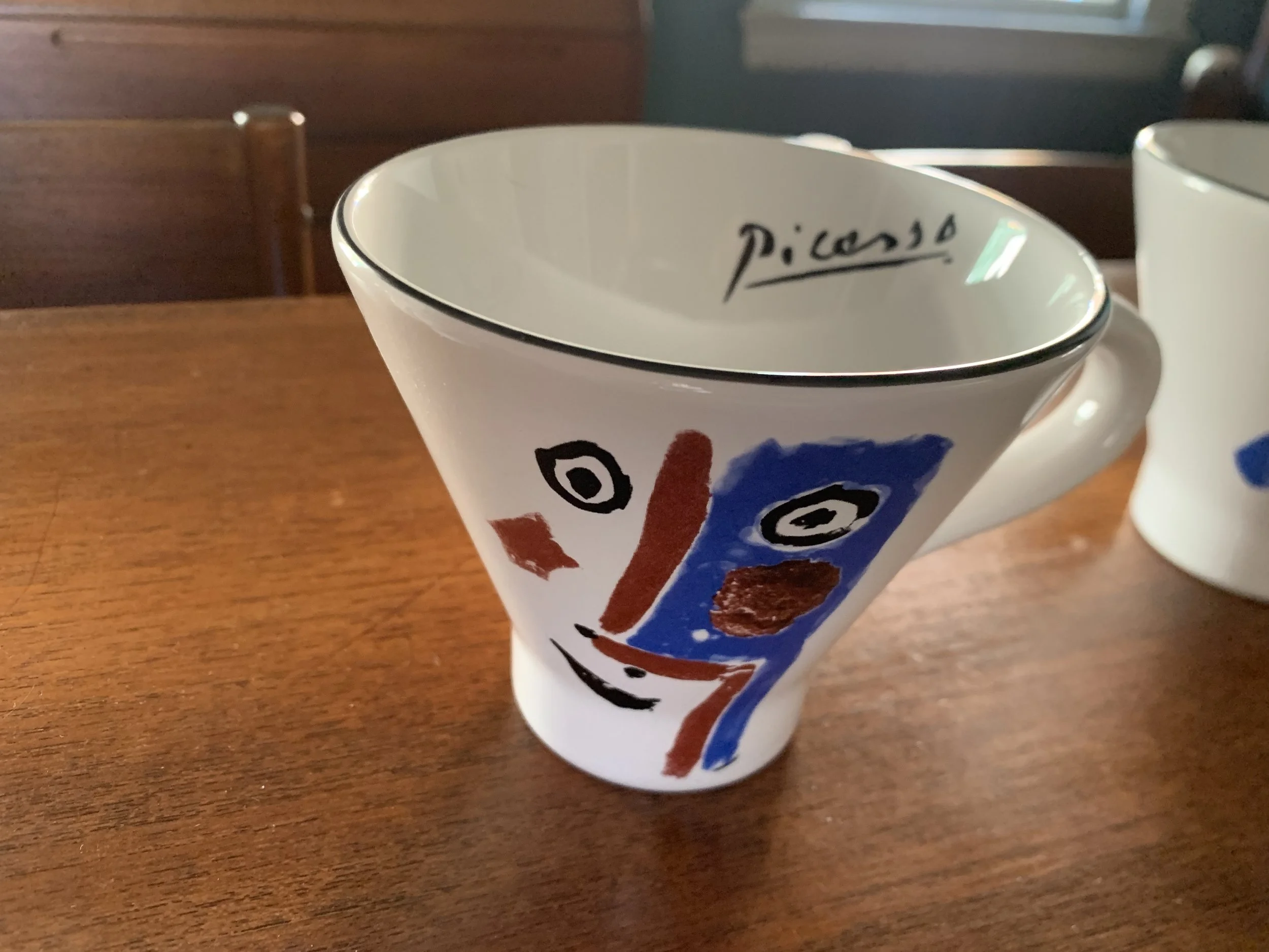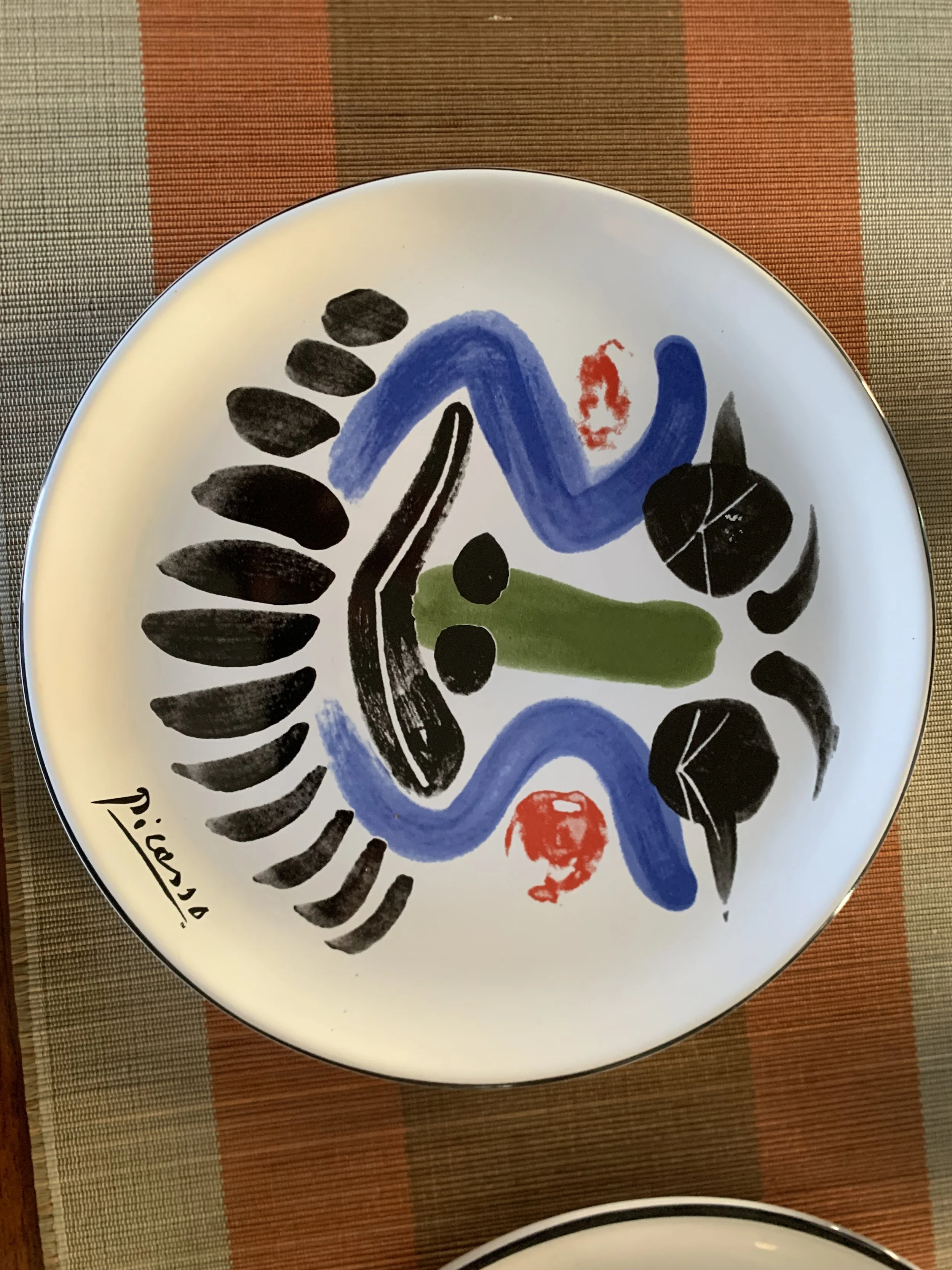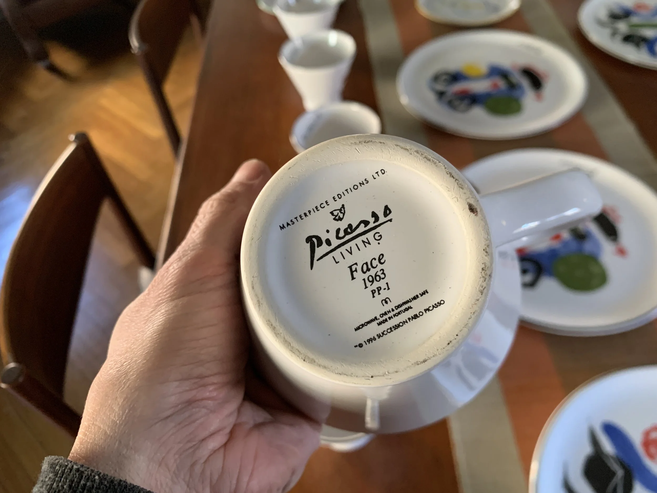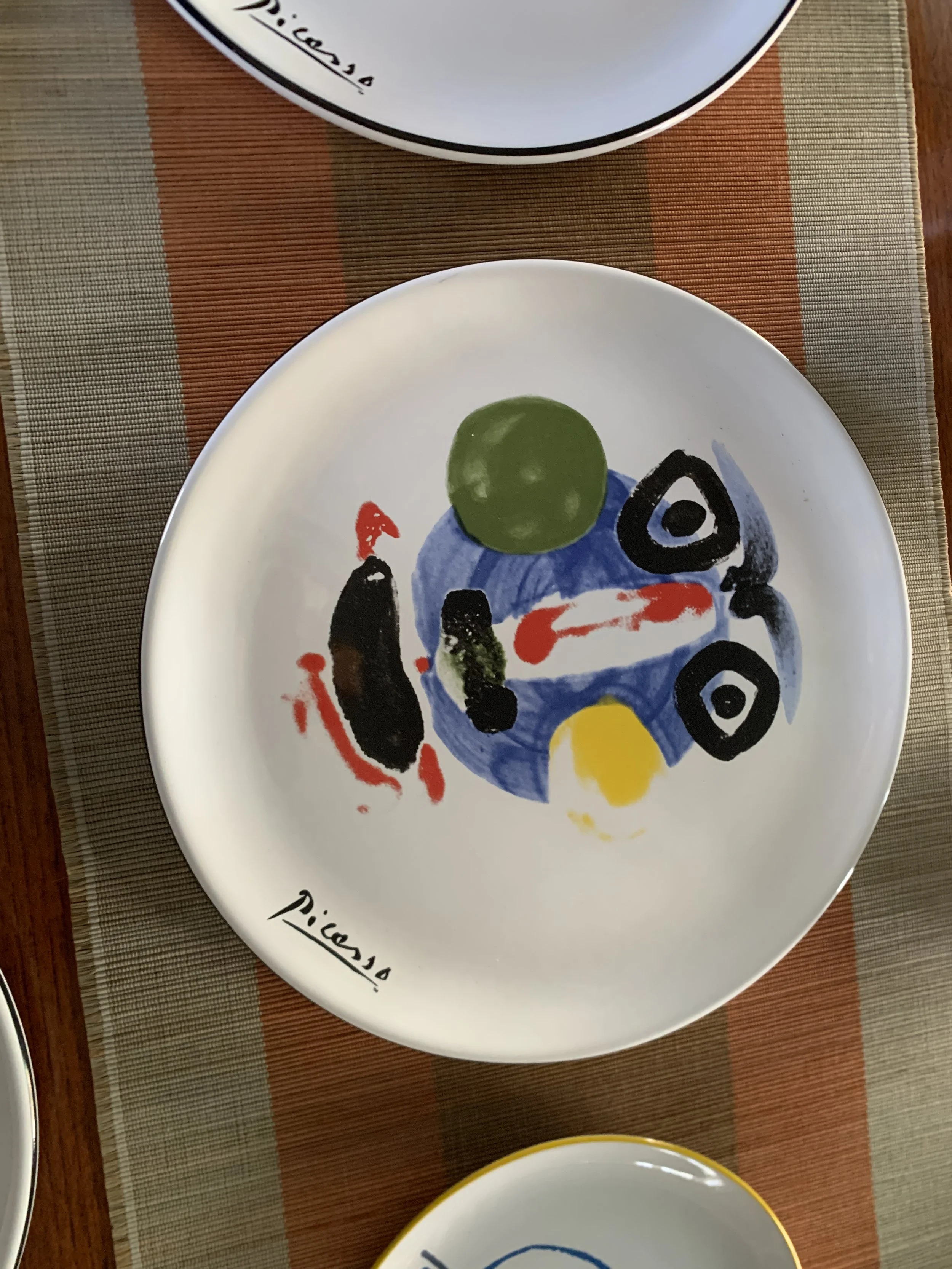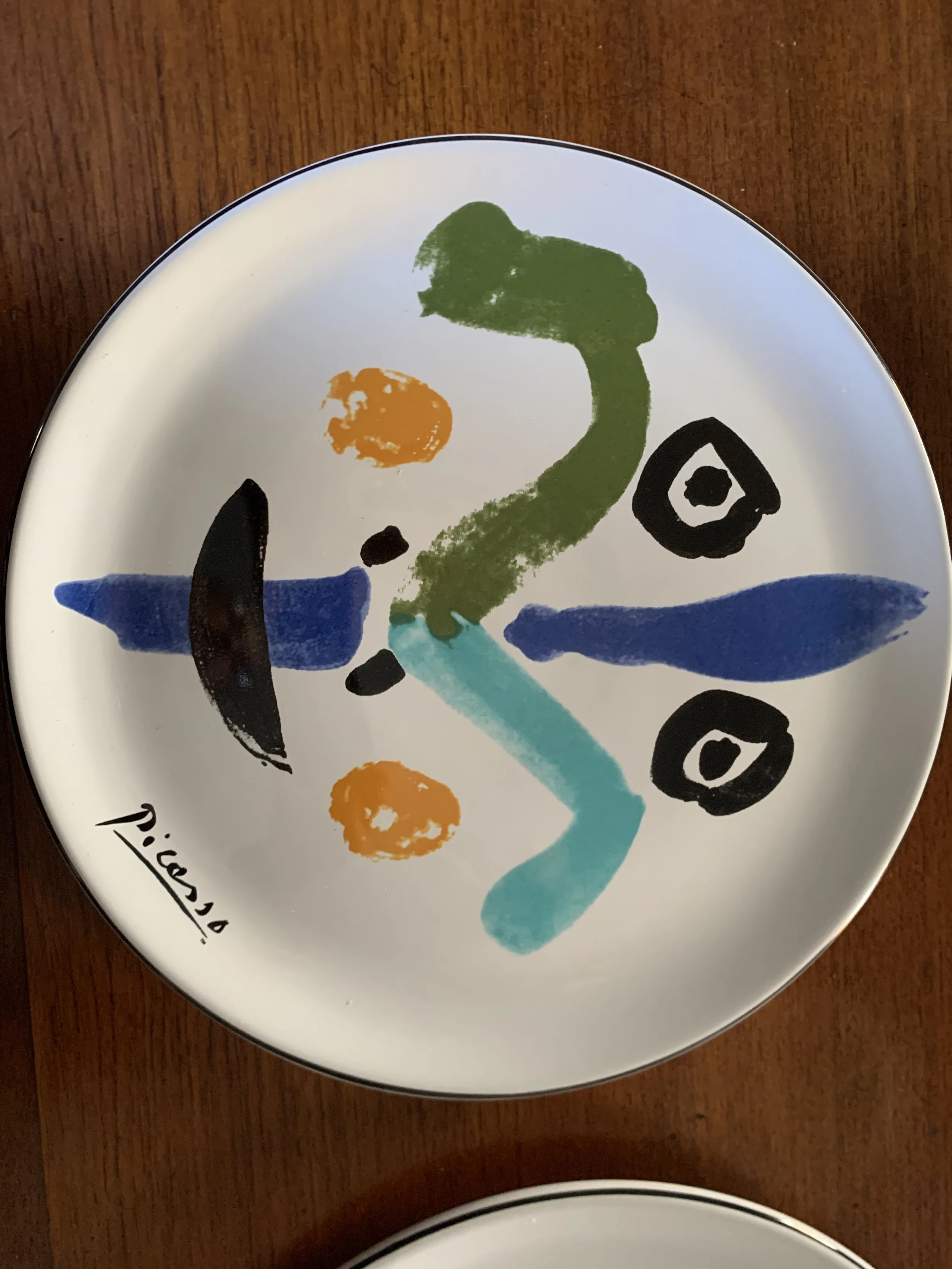 Large set of Picasso Living collection dinnerware. The "Face" Collection (1963) features minimalist, abstract faces on a white background with a thin black rim. This vintage dinnerware, produced in the mid-1990s by Masterpiece Editions Ltd., were typically manufactured in Portugal or Thailand and feature high-quality reproductions of Pablo Picasso's original artworks.