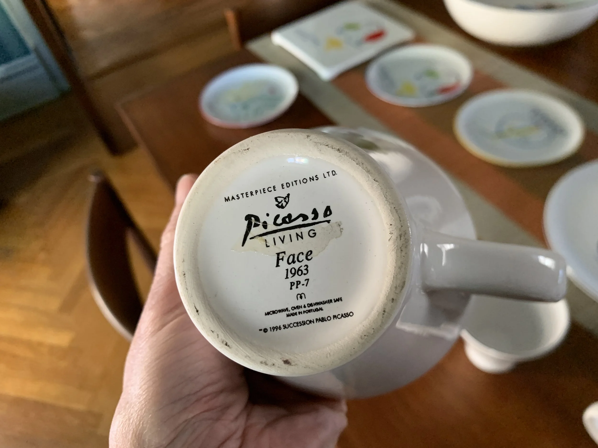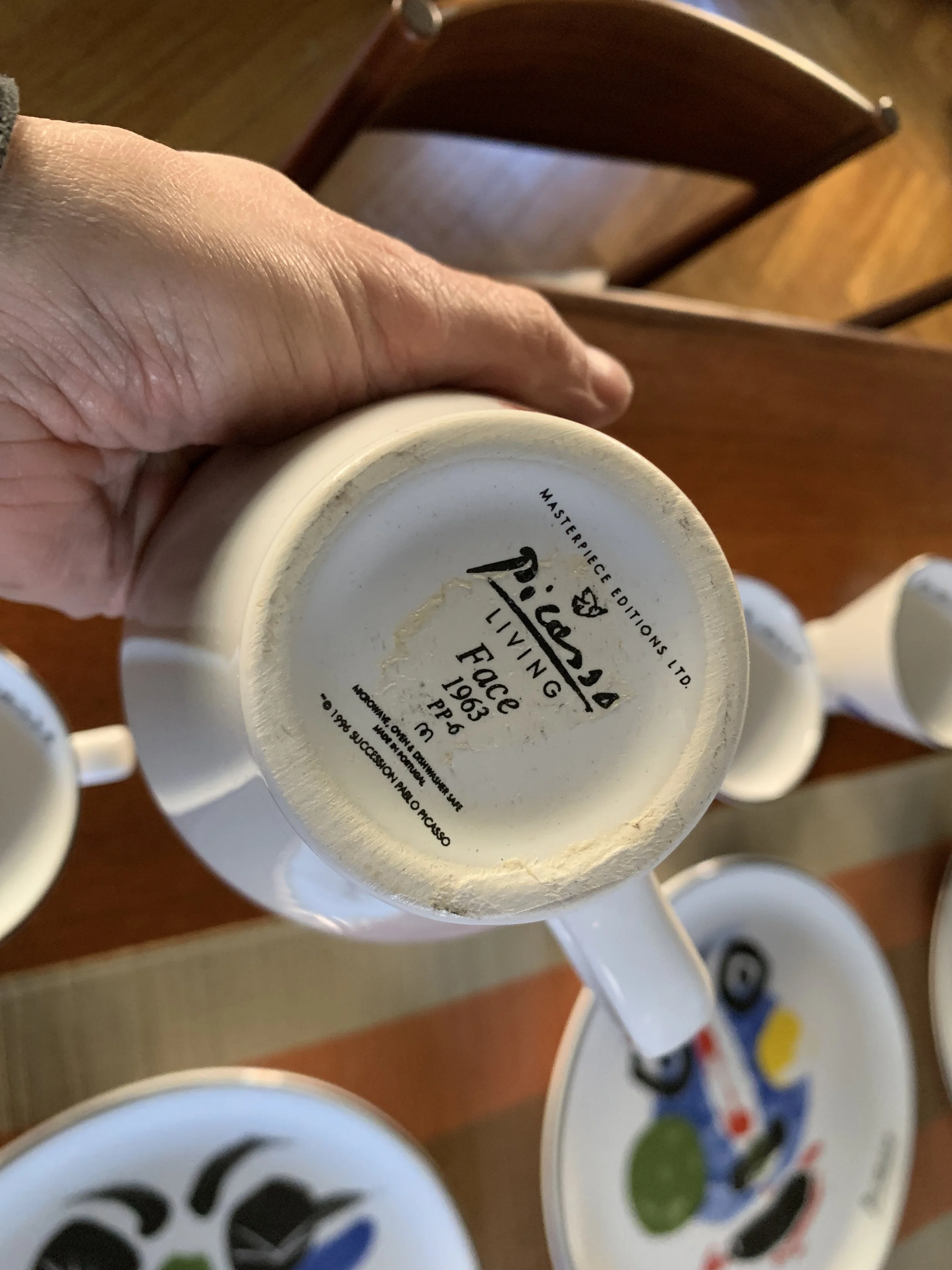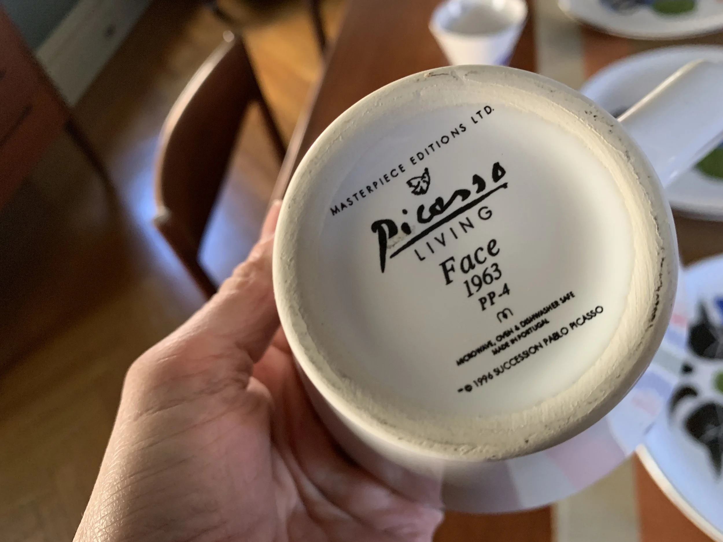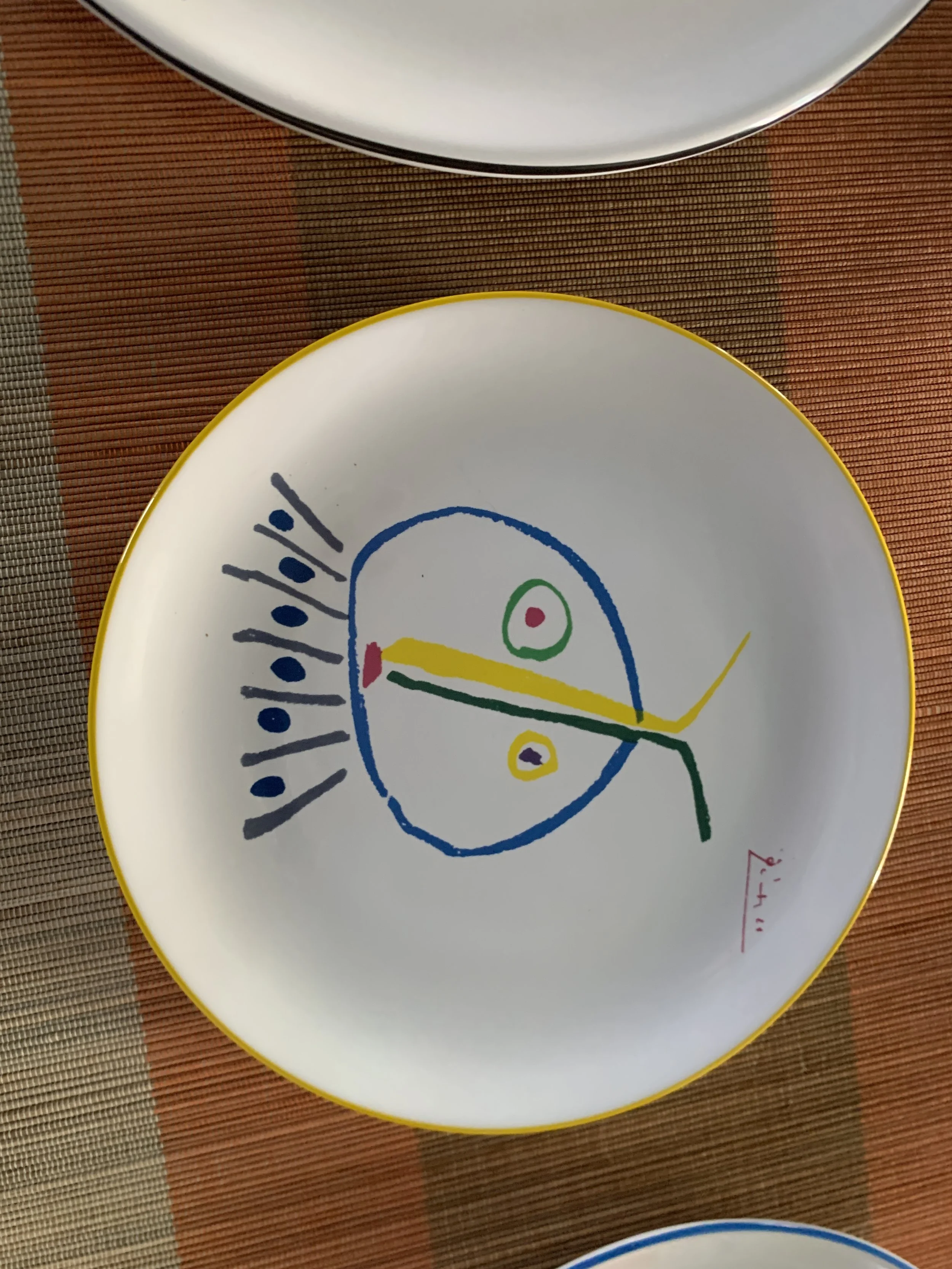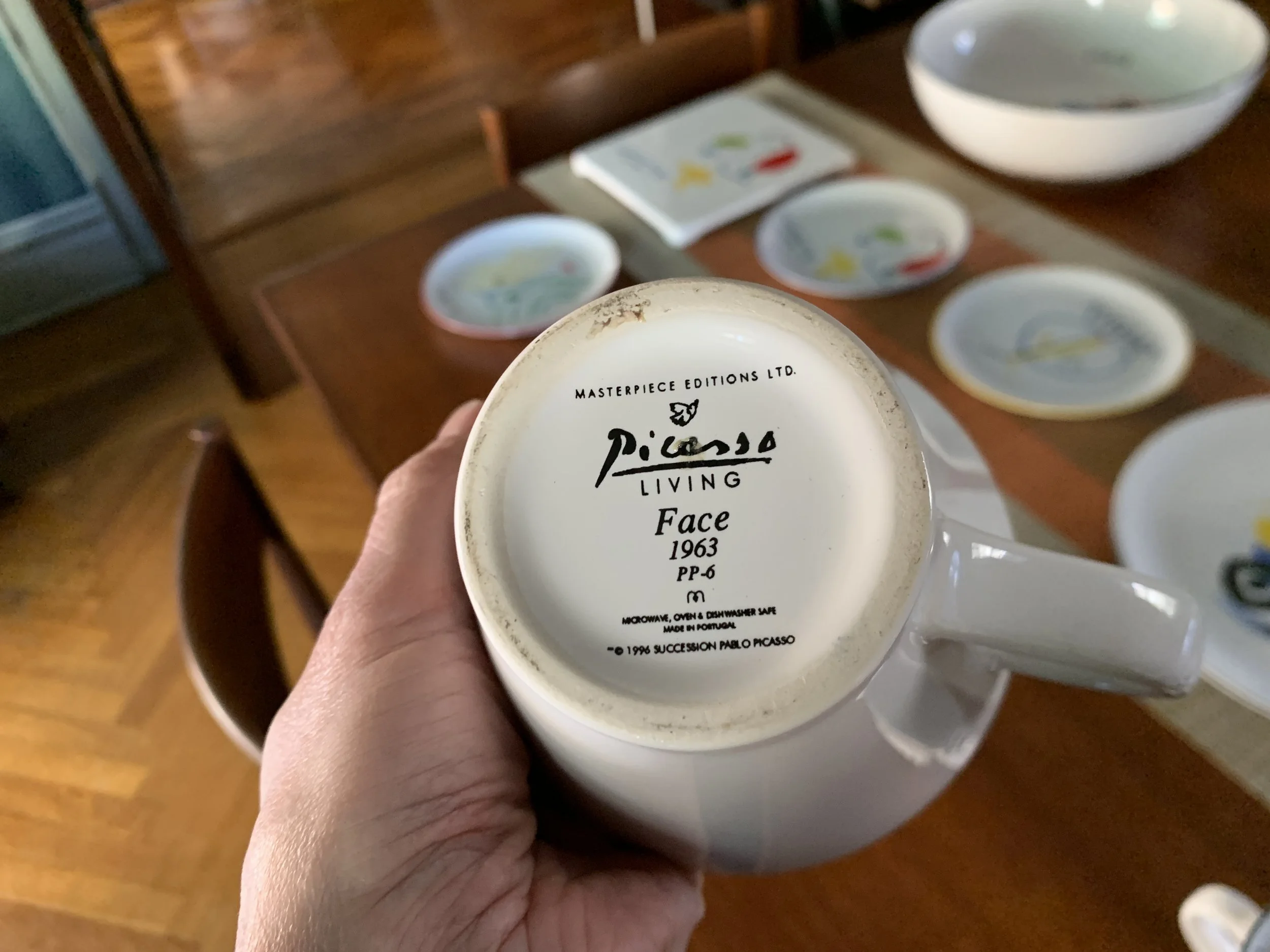 Large set of Picasso Living collection dinnerware. The "Face" Collection (1963) features minimalist, abstract faces on a white background with a thin black rim. This vintage dinnerware, produced in the mid-1990s by Masterpiece Editions Ltd., were typically manufactured in Portugal or Thailand and feature high-quality reproductions of Pablo Picasso's original artworks.