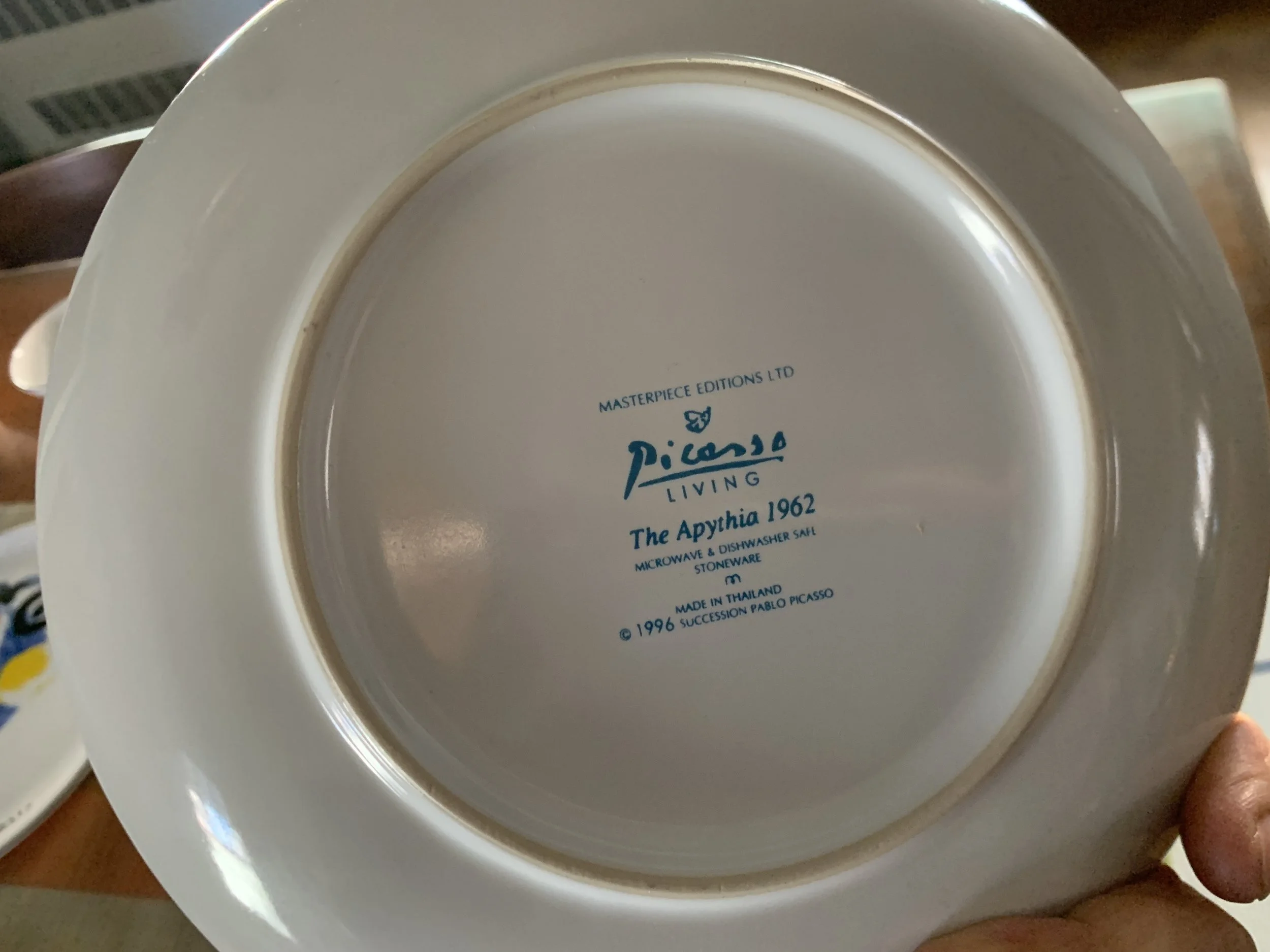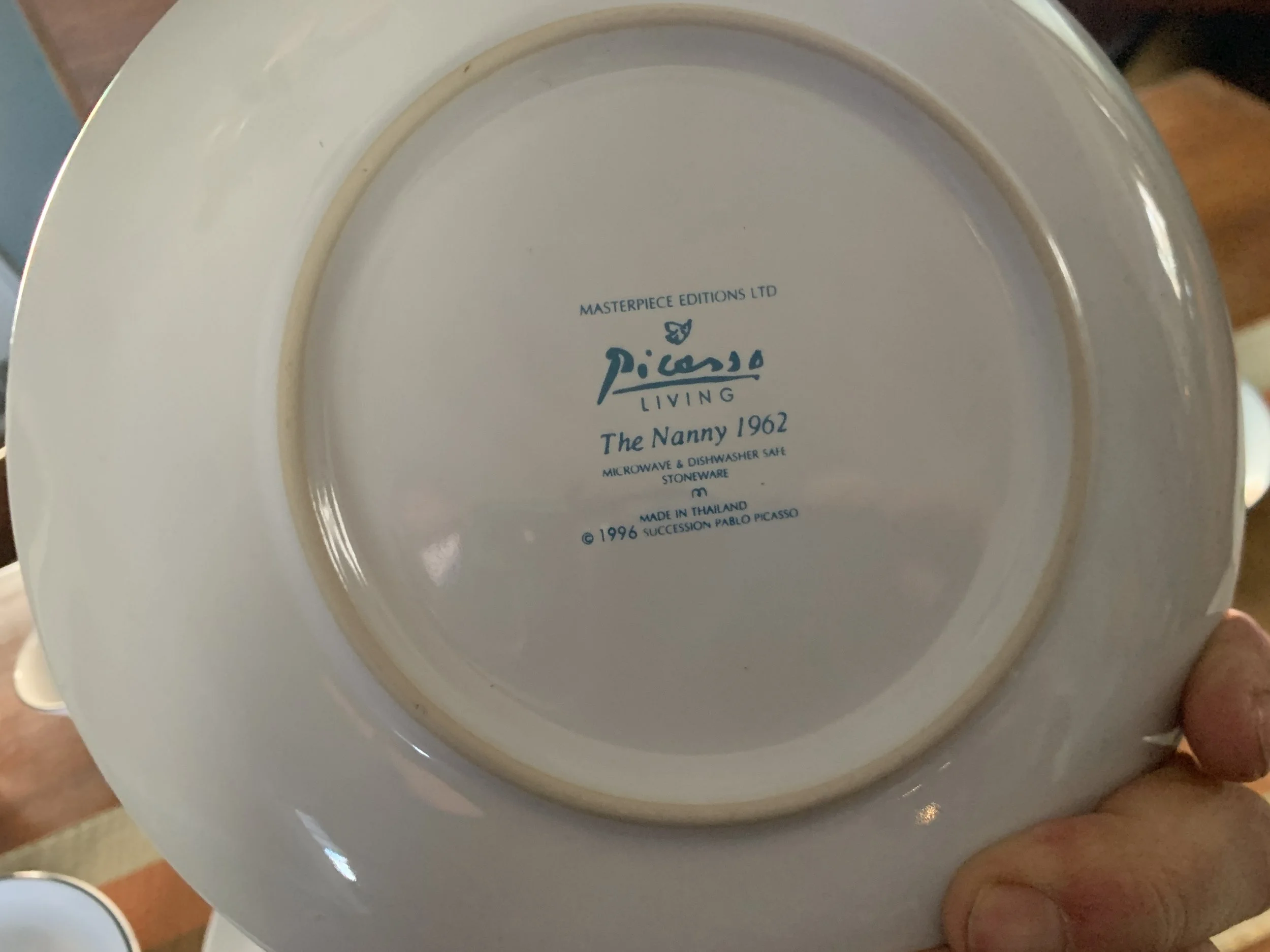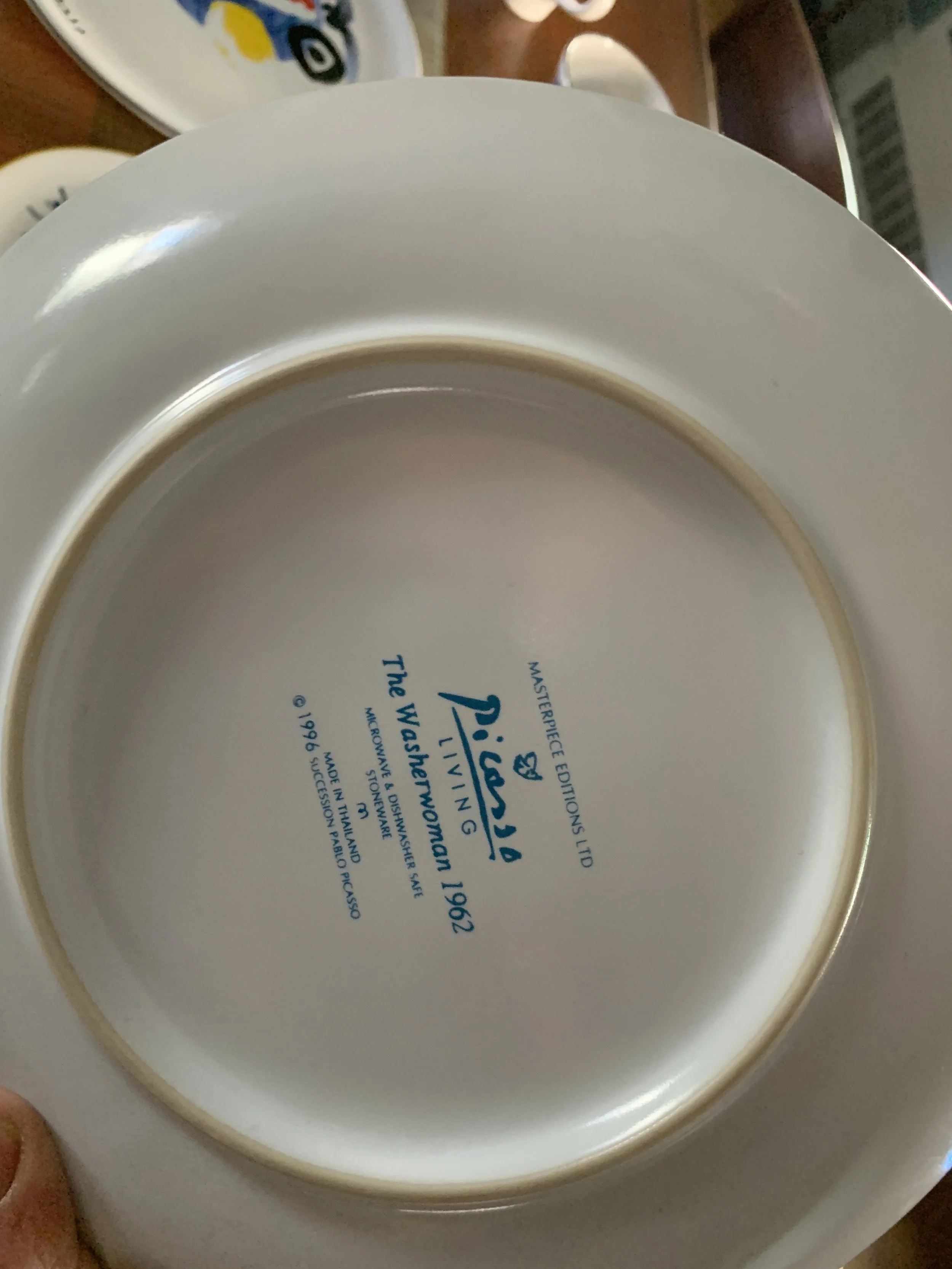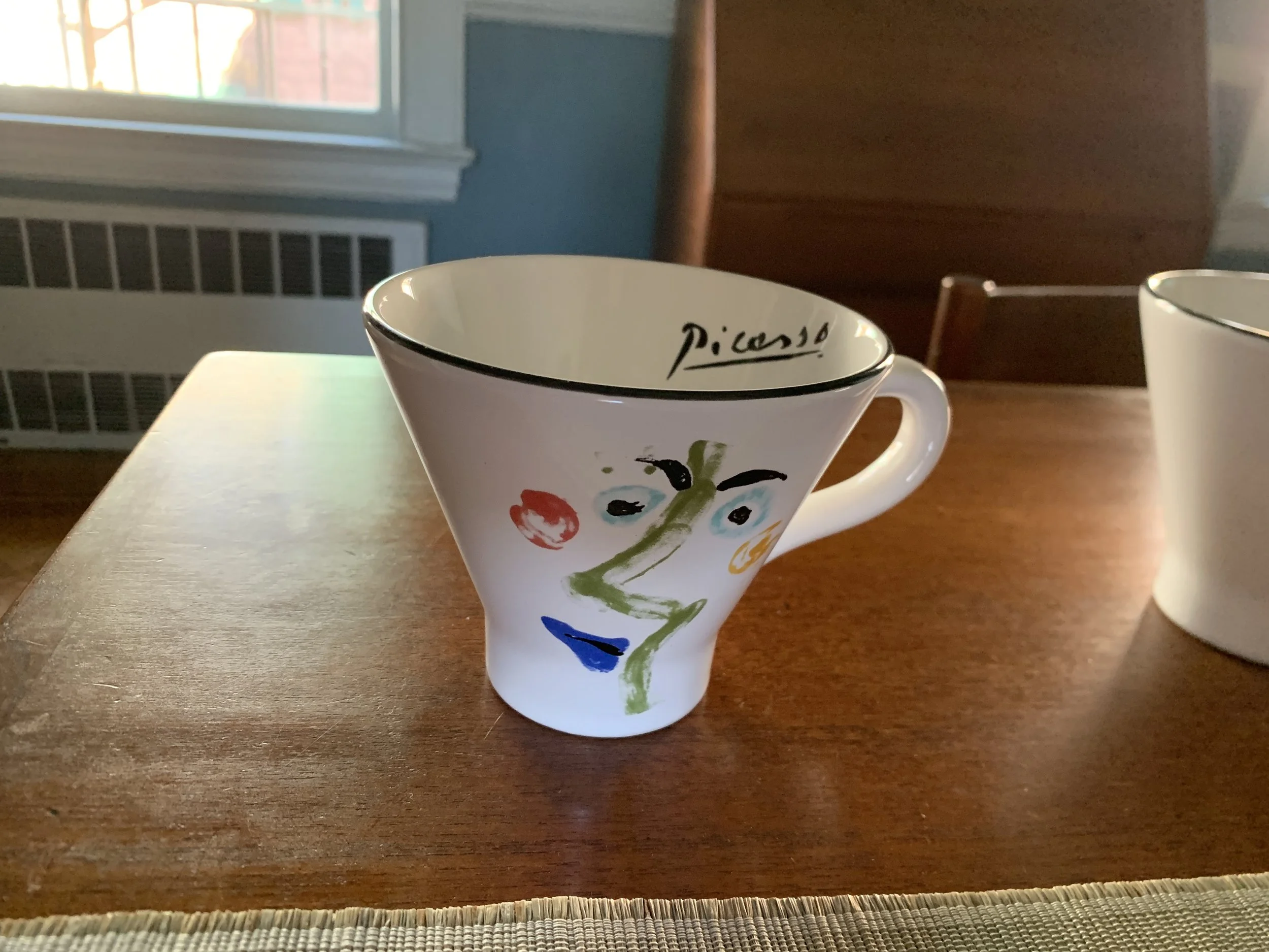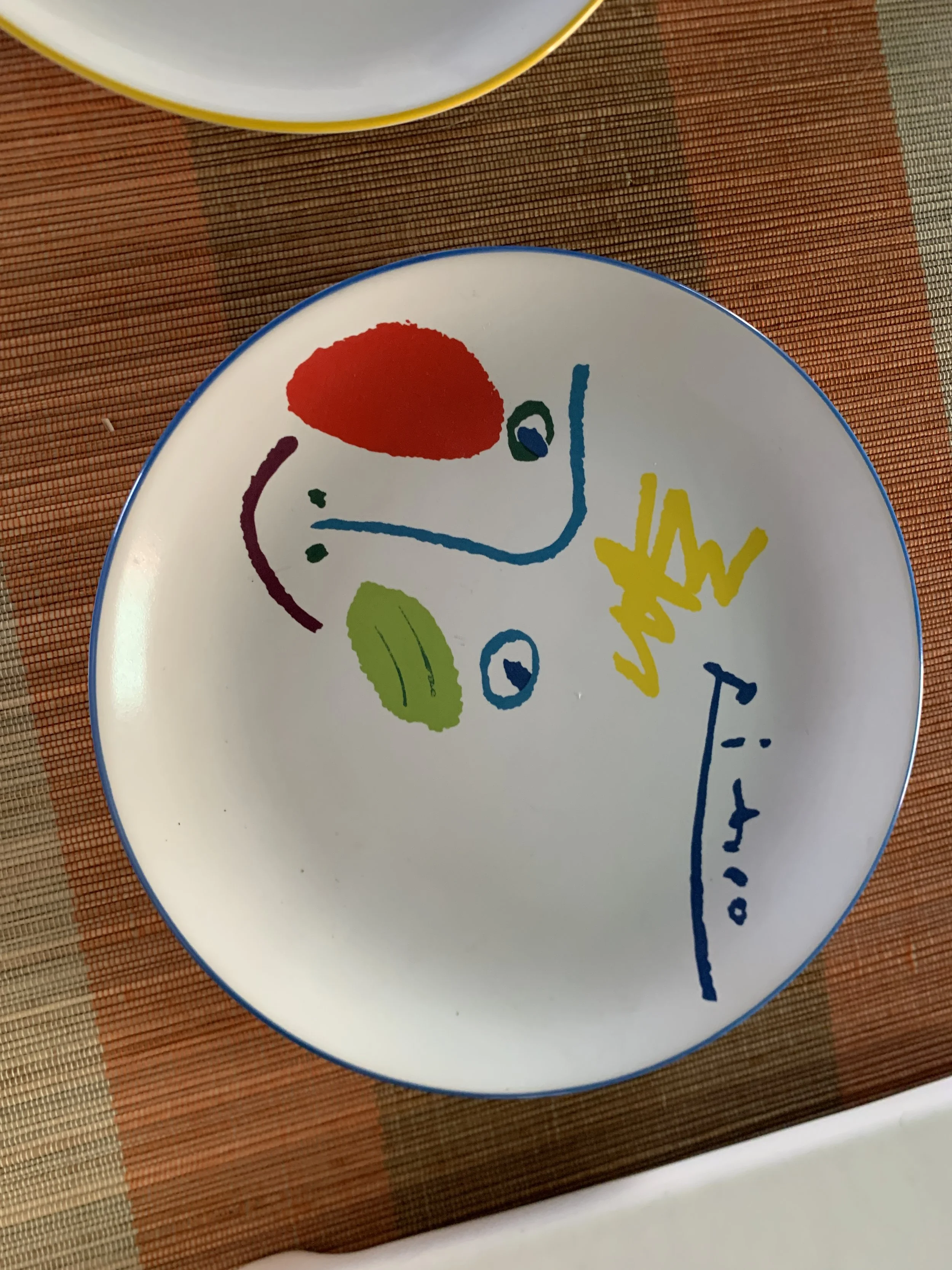 Large set of Picasso Living collection dinnerware. The "Face" Collection (1963) features minimalist, abstract faces on a white background with a thin black rim. This vintage dinnerware, produced in the mid-1990s by Masterpiece Editions Ltd., were typically manufactured in Portugal or Thailand and feature high-quality reproductions of Pablo Picasso's original artworks.